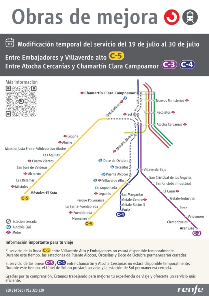 Asimismo, el Consorcio Regional de Transportes de Madrid ha anunciado que los usuarios afectados por estas interrupciones podrán utilizar gratuitamente los autobuses de la EMT como medida de apoyo durante este periodo.