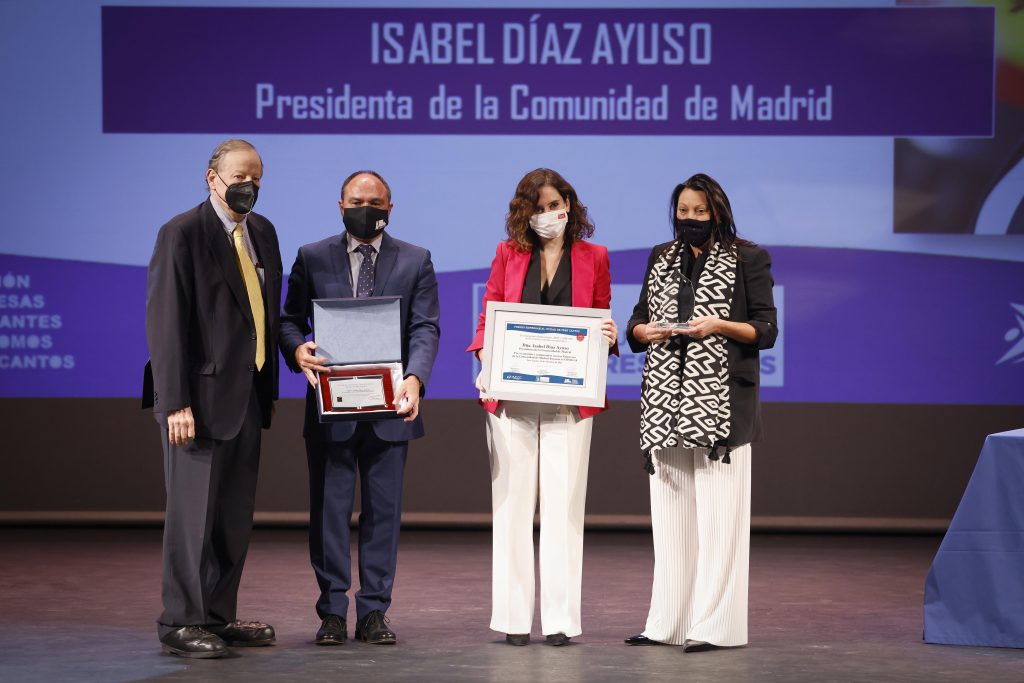 La presidenta de la Comunidad de Madrid, Isabel Díaz Ayuso, ha recibido este jueves el Premio Empresarial Ciudad de Tres Cantos en la categoría de Institucional, por su gestión con los comerciantes y hosteleros de la región durante la pandemia del COVID-19.