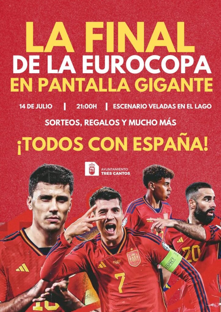 El domingo 14 de julio, Tres Cantos se une a la gran fiesta del fútbol con la retransmisión de la final de la Eurocopa. La película Mi querido monstruo, programada inicialmente para ese día, se proyectará el miércoles 24 de julio para evitar la contraprogramación. Desde las 20 horas, habrá música y sorteos para animar a los seguidores, y a las 21 horas se transmitirá el partido entre España e Inglaterra en una pantalla de 24 m² en el Parque Central. Se dispondrán 800 sillas para los asistentes.