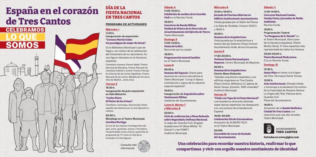 El Ayuntamiento de Tres Cantos ha preparado una amplia programación para conmemorar la Fiesta Nacional 2025, que se extenderá hasta el próximo 12 de octubre con más de veinte actividades culturales, sociales, deportivas e institucionales. Una celebración que busca rendir homenaje a la historia de España, a la identidad cultural y al sentimiento de unidad que caracteriza a esta festividad.