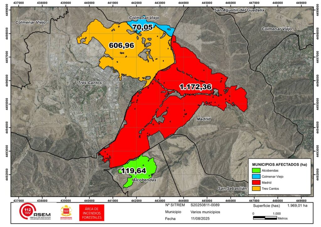 El devastador incendio declarado la pasada semana en la zona de Tres Cantos ha calcinado un total de 1.969 hectáreas. El informe de la Agencia de Seguridad y Emergencias de Madrid (ASEM) detalla que Madrid es el municipio más afectado, con 1.172 hectáreas arrasadas, mientras que Tres Cantos ha perdido 606,9. En menor medida, las llamas alcanzaron zonas de Alcobendas y Colmenar Viejo.